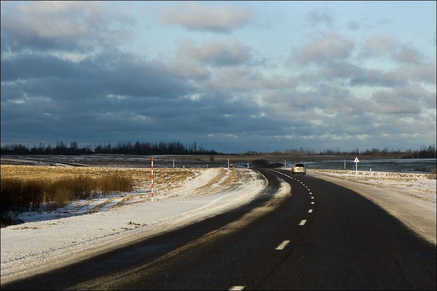 Про белорусские трассы нужно сказать отдельно. Они на самом деле очень приличные. То есть имеется в виду не просто качество покрытия (асфальт практически такой же, как в России — частично новый, частично латанный, почти без ям), а именно общее качество дорог, т.е. это удобные обочины (для медленных тачек как раз что надо), дорожные знаки (всё грамотно расставлено, без лишних/забытых знаков, без участков где вообще нет знаков), указатели не вводят водителей в заблуждение, лежачие полицейские у второстепенных дорог.